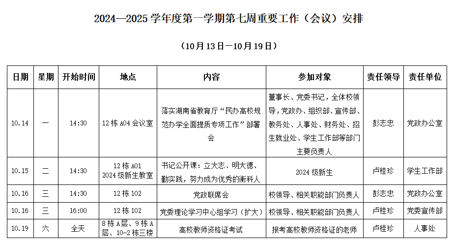 2024—2025学年度第一学期第七周重要工作(会议)安排(10月13日-10月19日)