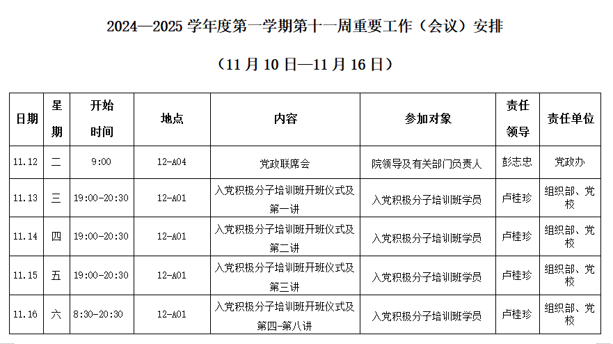 2024—2025学年度第一学期第十一周重要工作(会议)安排(11月10日-11月16日)