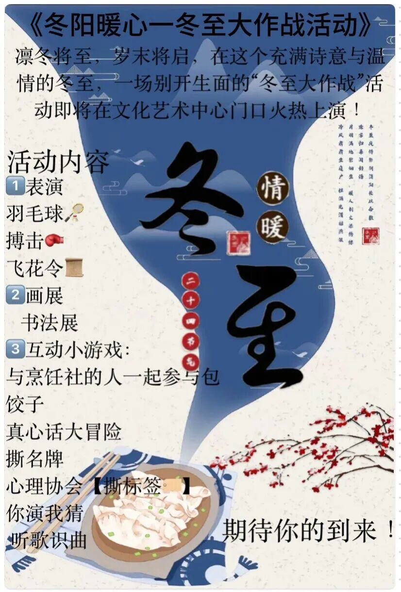 为了让衡科学子们感到”冬至"的特别,让本地人觉得有冬至感觉,让外省来求学的学子们有家的感觉。我们在12月17日星期二,在文化中心举行一场【冬至大作战】活动,一起加入吧!