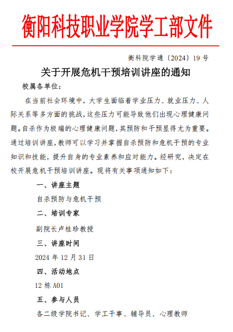 衡科院学通 19号 12月19日关于开展危机干预培训讲座的通知