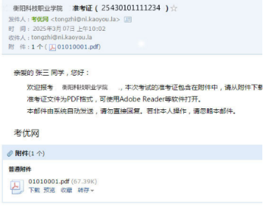 5、下载打印准考证:点击 “打印准考证” 按钮,可通过两种方式获取准考证。一是下载到手机,将准考证文件保存到手机后,通过电脑连接手机数据线复制到电脑再打印;二是发送到电子邮箱,绑定自己的电子邮箱后,点击按钮将准考证发送至邮箱,在连接打印机的电脑上或前往打印店打印。准考证文件为 PDF 格式,可使用Adobe Reader等软件打开。