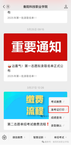 1、关注学校微信公众号:扫描指定二维码关注我校微信公众号,通过公众号菜单 “单招考试 - 准考证打印” 进入打印准考证系统。