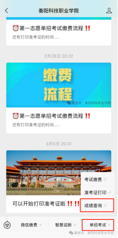 通过公众号菜单“单招考试-成绩查询”进入成绩查询系统