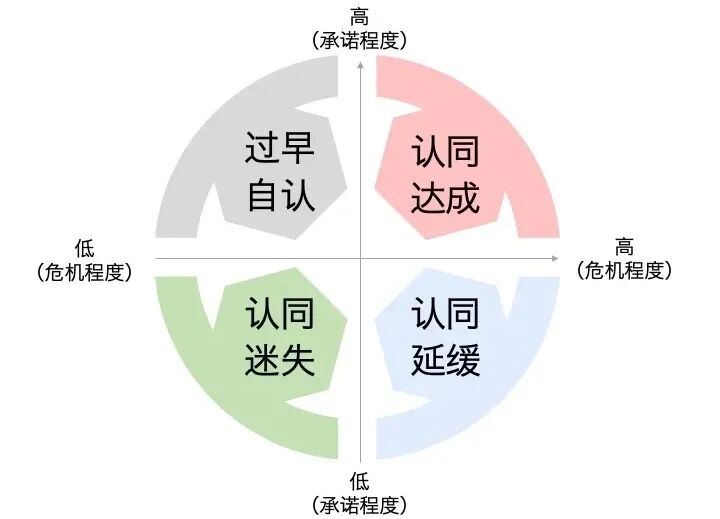 心理学家Marcia根据“过去的危机”与“现在的承诺”两个维度将人们对于“自我认同”这个重大人生任务的完成情况详细分成了四种不同的状态:过早自认、认同迷失、认同达成与认同延缓。