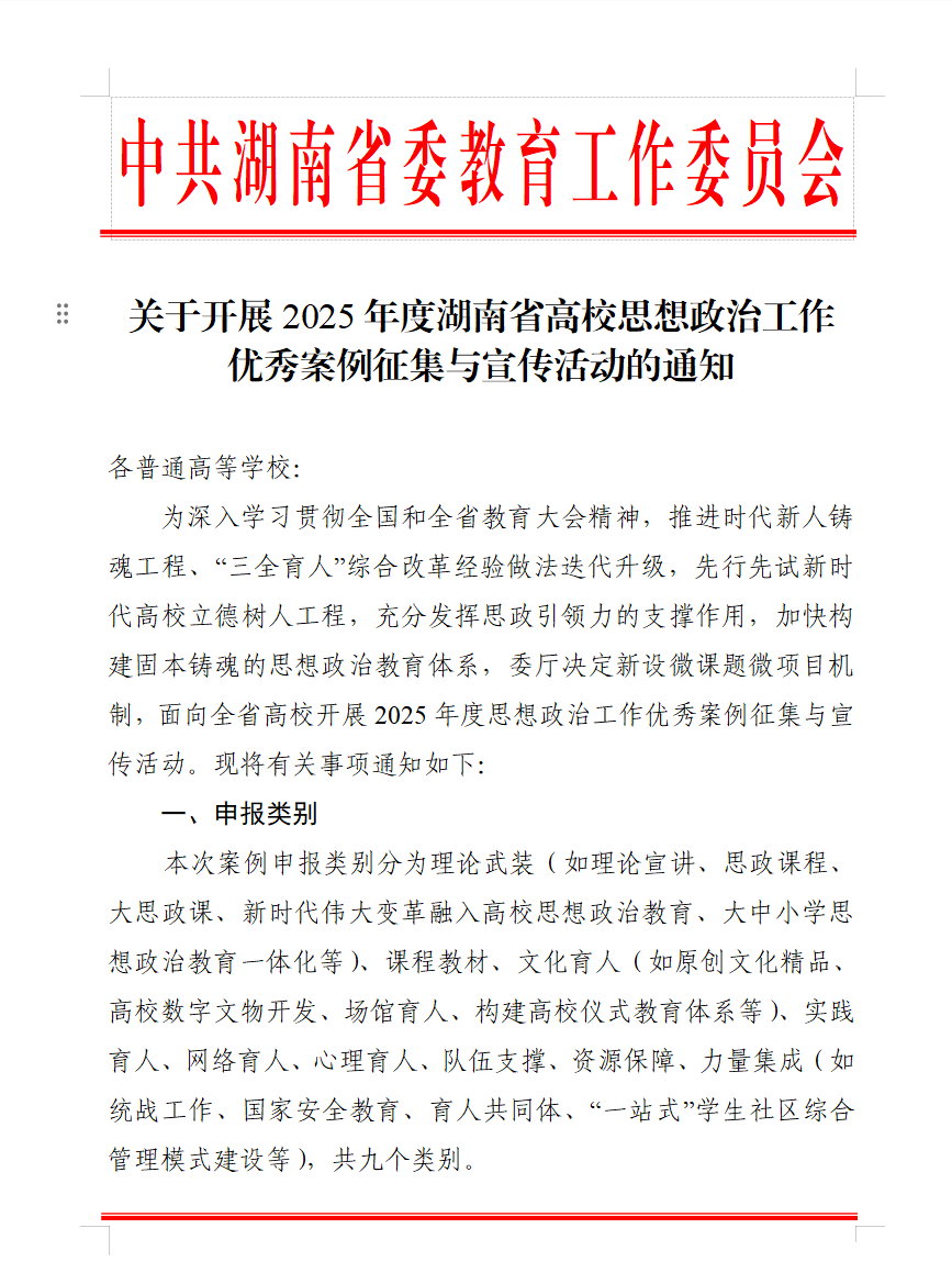 点击阅读源文件:关于开展2025年度湖南省高校思想政治工作优秀案例征集与宣传活动的通知.pdf