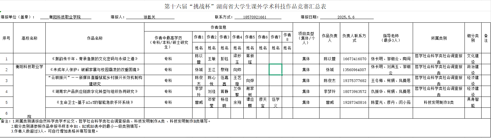 附件1:第十六届“挑战杯”湖南省大学生课外学术科技作品竞赛参赛项目拟推荐汇总表
