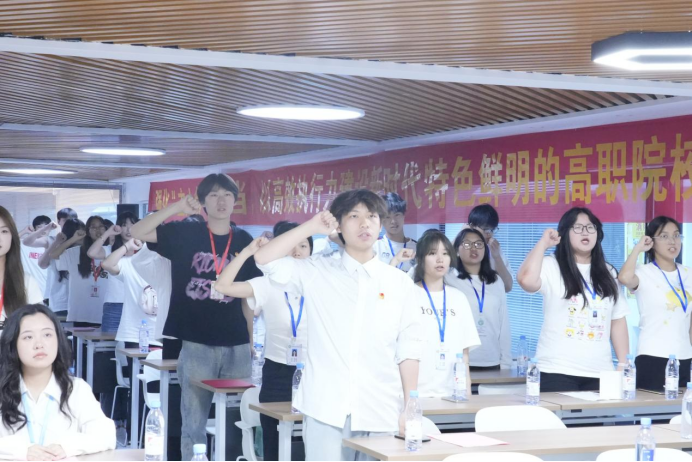最后,全体两会成员庄严宣誓。一句句铿锵有力的誓言,回荡在会议室里,是他们对责任的承诺,对使命的担当。此次换届大会的圆满举行,为医药卫生学院团总支、学生会注入了新鲜血液。相信在新一届干部的带领下,两会将继续秉持服务初心,勇担青春使命,在医路征程中书写更加绚丽的青春篇章!