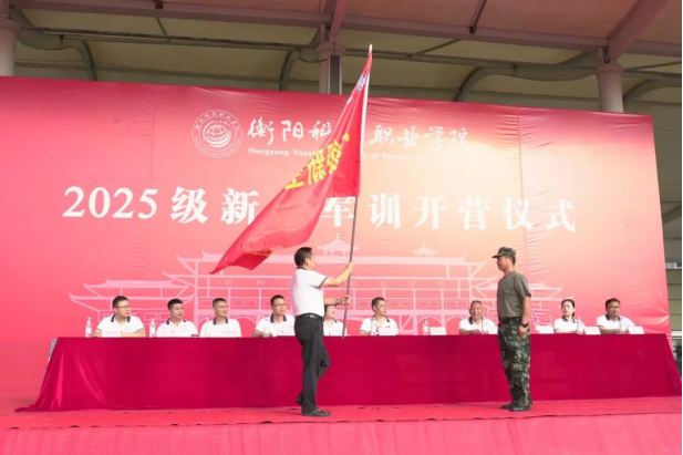 随后,现场教官为大家带来了精彩的风采展示,他们步伐整齐划一、落地铿锵有力,尽显军人刚毅本色。仪式高潮处,常务副校长肖启梁手持鲜艳的军训团旗,郑重交予军训团团长常迎辉,这不仅是军训任务正式启动的信号,更承载着学院对2025级新生的深切期许与美好祝福。