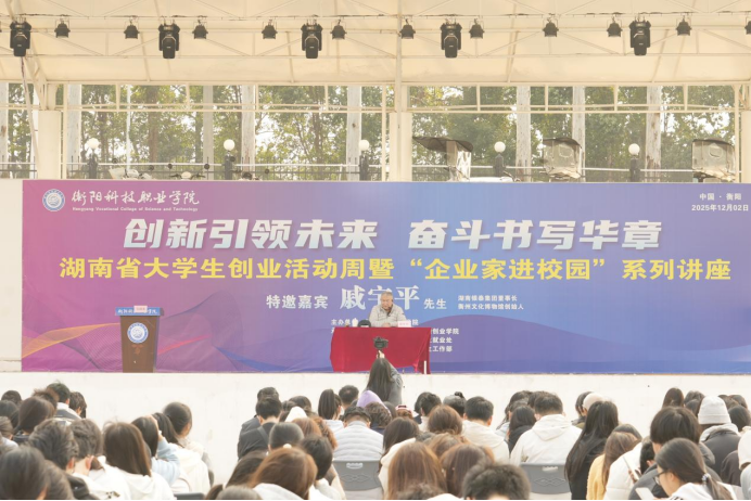 为深入贯彻落实湖南省大学生创业活动周及“企业家进校园”系列活动精神,营造浓厚的创新创业校园氛围,2025年12月2日下午,mg冰球突破豪华版试玩网站在运动场隆重举办了“创新引领未来,奋斗书写华章——与戚宇平先生对话青春”专题讲座。本次活动特邀银泰集团董事长、衡州文化博物馆创始人戚宇平先生担任主讲嘉宾。全校近两千名师生齐聚一堂,共享这场思想与智慧的盛宴。