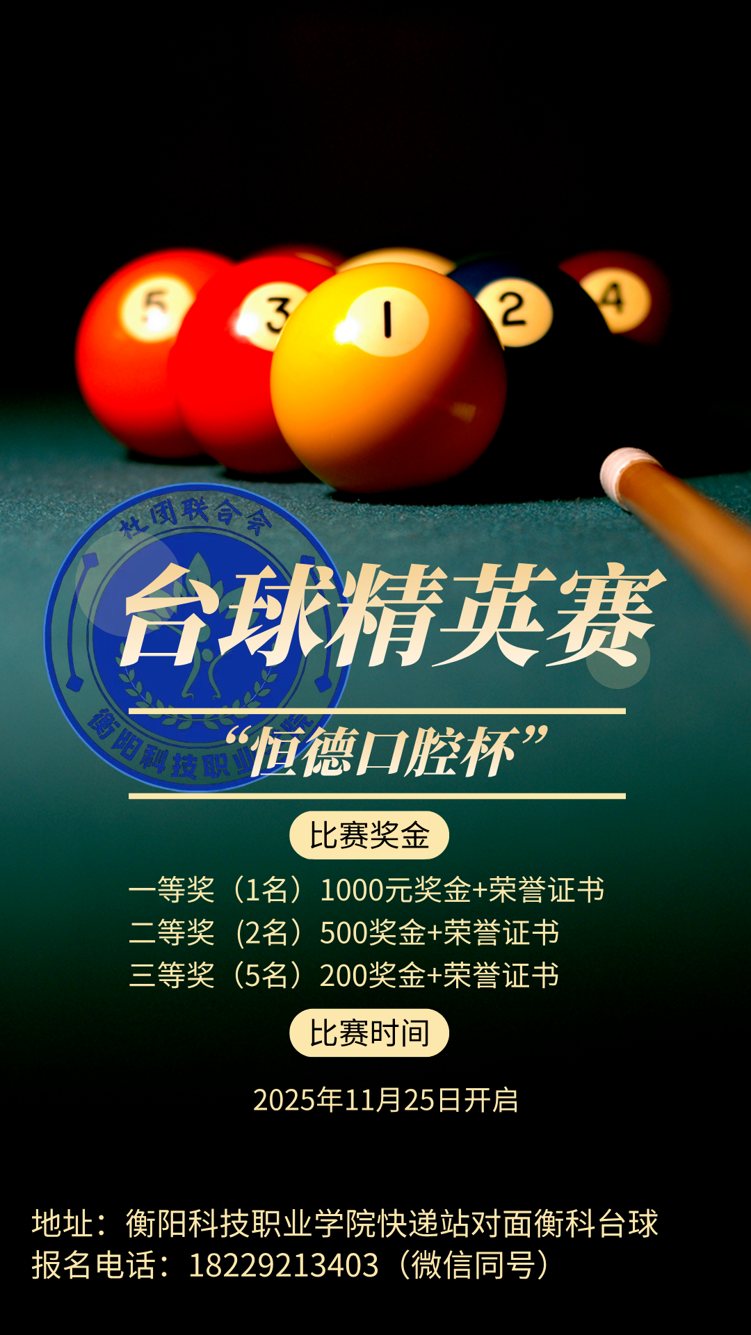 “本次比赛由恒德口腔、衡科台球厅冠名赞助”