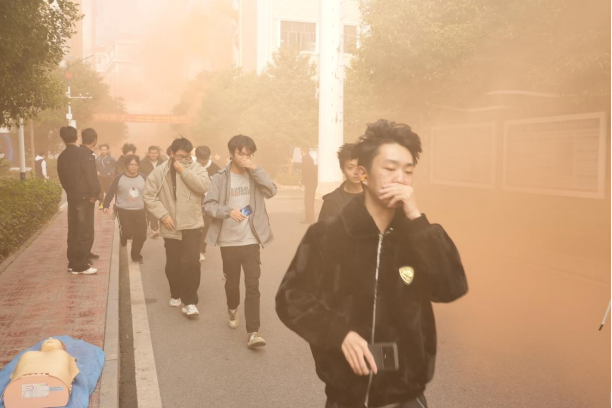 警报响起后,各楼层引导员迅速到位,挥舞引导牌指挥师生疏散;现场工作人员立即组织学生用湿毛巾捂住口鼻,沿墙壁快速移动至安全通道。整个疏散过程中,师生们沉着冷静,严格遵循逃生规范,无拥挤、无慌乱现象。仅用时3分15秒,所有参演人员便全部安全撤离至操场指定集结区域,各二级学院辅导员迅速完成人员清点并向总指挥汇报,实现“全员安全、无一遗漏”的既定目标。