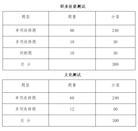报考我校所有类别考生需进行职业技能测试。考试内容:包括中华优秀传统文化知识、职业道德、人际交往、时事政治等内容,合计300分。