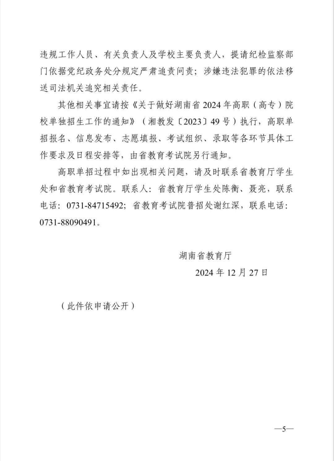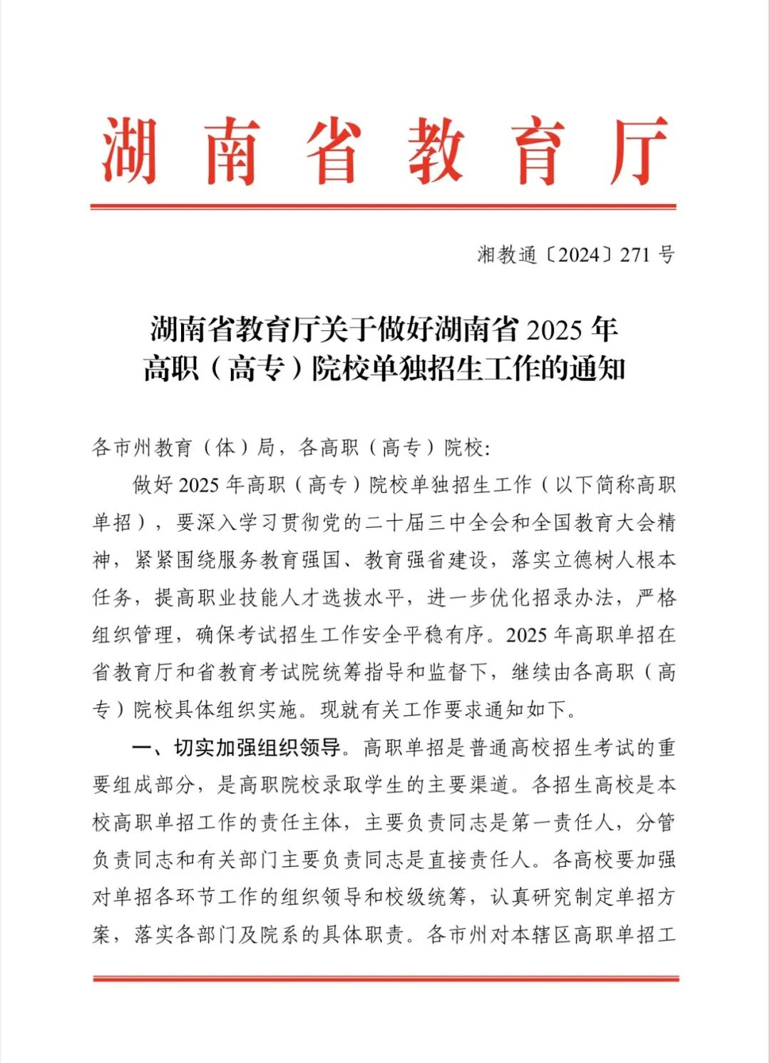 湖南省关于2025年单独招生工作通知|25年院校组织考试,非统考!